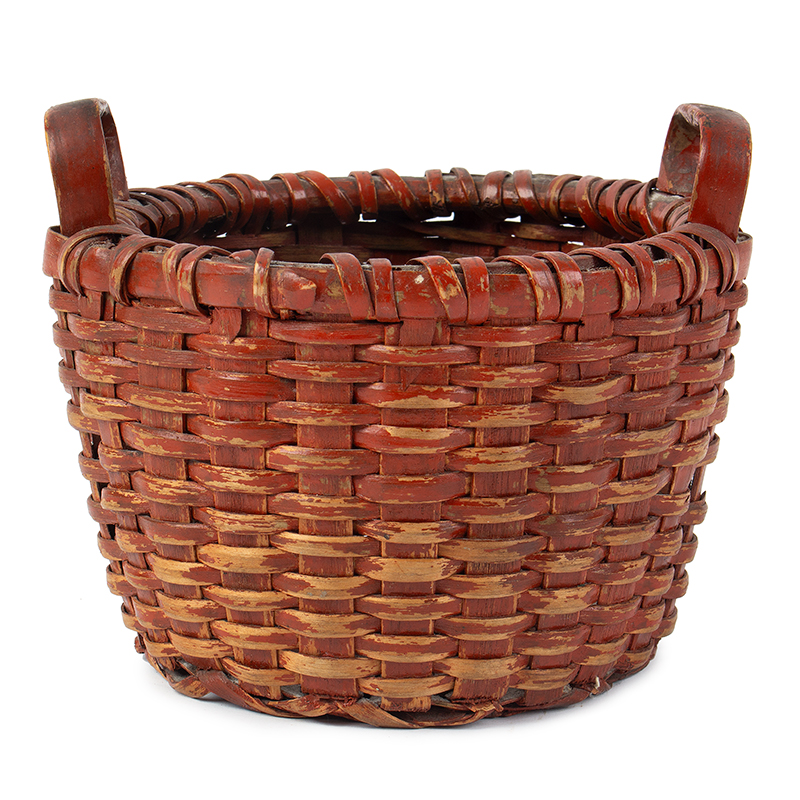 Miniature Splint Gathering Basket in Red Paint, Carved Notched Handles - Antique Associated At West Townsend