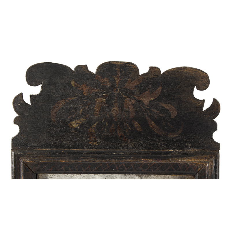 The scrolled crest above molded frame displays a leafy floral design; frame is ornamented with cross hatching.