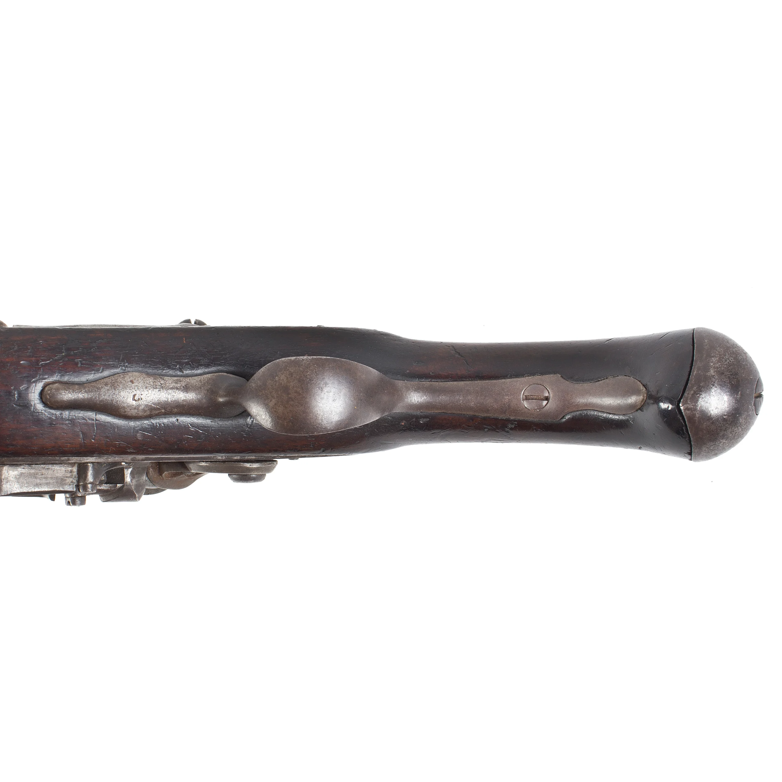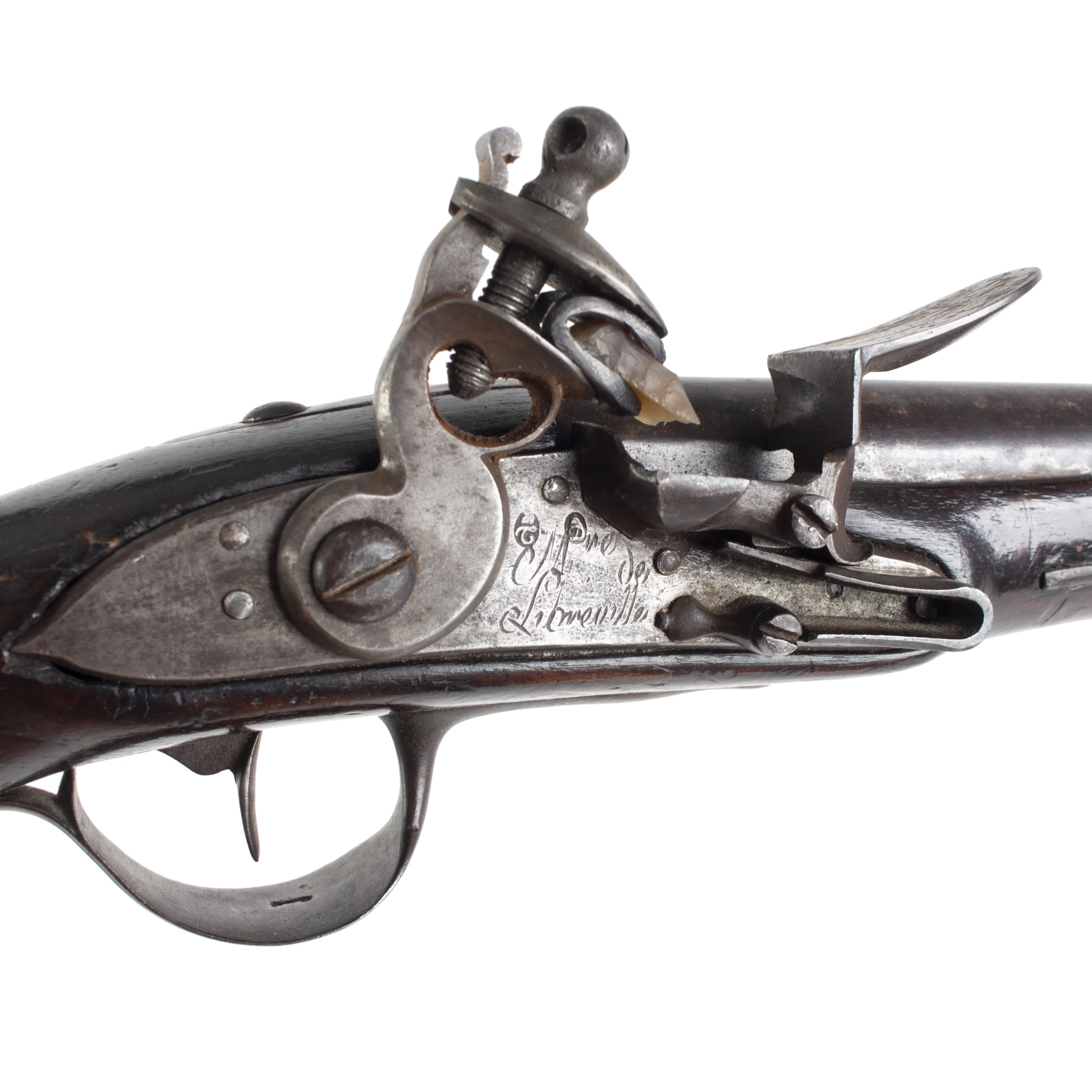 The tang is very lightly engraved with model designation “763” [“M1763”] Original flint, lock with iron pan, flat plate engraved “Mre de / Libreville;” action in working order. Walnut stock with iron furniture. Complete with iron ramrod.
