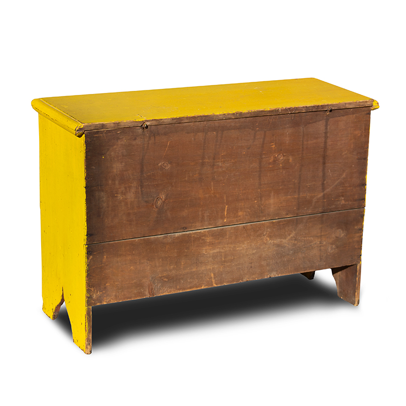 An honest and colorful example of great presence exhibits lovely proportions. As for the old yellow paint: This bold chrome yellow (or similar mustard/yellow ochre) over pine became quite popular in rural New England and Mid-Atlantic areas in the second half of the 18th century, often to brighten homes. The paint is vintage…quite old – we suggest first quarter [or slightly after] the 20th century.