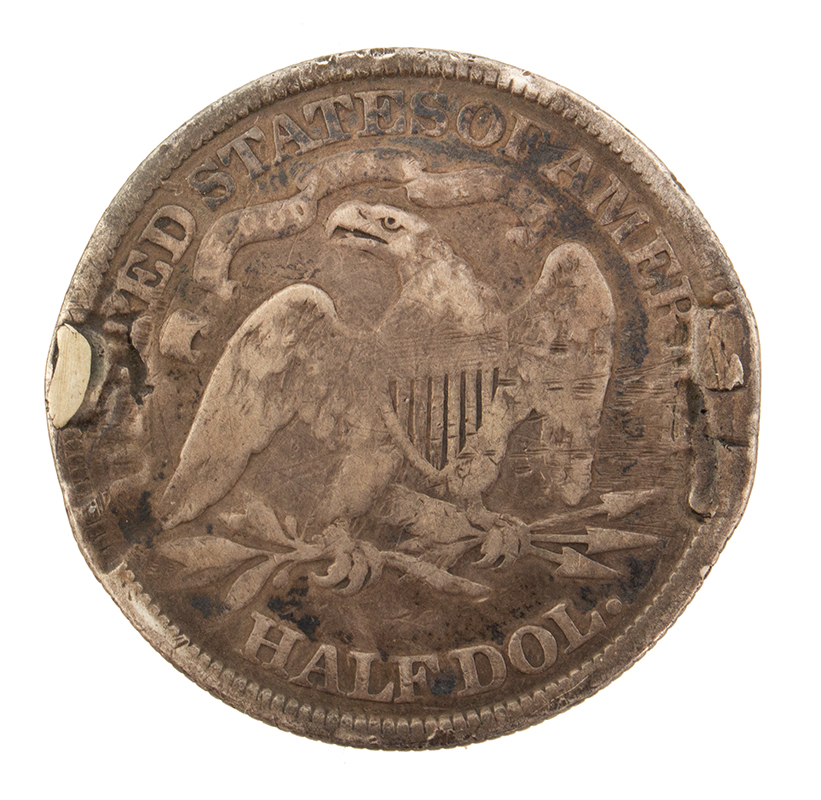 Engraved Railroad Badge Made From a Motto Liberty Seated Half Dollar
