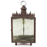 Item Condition: Good overall condition; expected usage wear, scattered trivial denting. Our tinsmith restored the top lip of door the secures the glass; one side of strap handle has been resoldered. The lamp lacks a font.