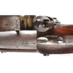 The Model 1836 pistols manufactured by Waters generally saw much use (unlike those by Johnson, many of which were not used) therefore it is very unusual to find a Waters pistol in truly nice condition…a great collector’s specimen. A clean example…the lock is clearly marked A. WATERS – MILLBURY, MS. – 1842; the left rear of barrel is marked at breech: US over NWP over P. The wood is excellent, sharp contours; great grain, two good cartouches on the left side: JH and WAJ. This example is in original flint; rammer assembly is original. All metal parts in very good bright condition with some scattered and minor dark mottling…miniscule shallow smooth pitting at right side of .54-caliber 8.5-inch barrel, above rammer assembly which we mention for accuracy; doesn’t distract or compromise. Brass blade front and “U” notch rear sights; detachable brass flash pan; swiveling ramrod, single barrel band attached to the side plate. Mechanically excellent, smooth and tight action.