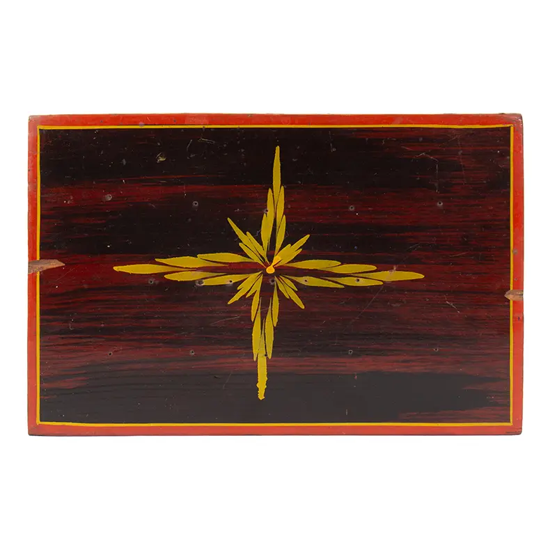 Decoration: The top features an outstanding bold, freehand-painted yellow emblem on a broadly brushed black on red ground – looks like a distinctive multi-pointed starburst or stylized flower with radiating leaf-like petals. The top is framed by a vibrant red outer border with a thin yellow conforming pinstripe inside.