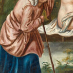 In February of 1984 Mary Black wrote a letter to the owner of this painting, [responding to a letter written by Robert Bishop] she copied Robert Bishop, then director of the American Folk Art Museum. She shared that the picture “fit into a group of religious paintings produced along the Hudson in the years between about 171700 to about 1750. The Albany provenance appears to confirm this grouping. The only other religious painting that is dated is the 1713 “Birth of the Virgin,” signed by Gerardus Duyckinck”.