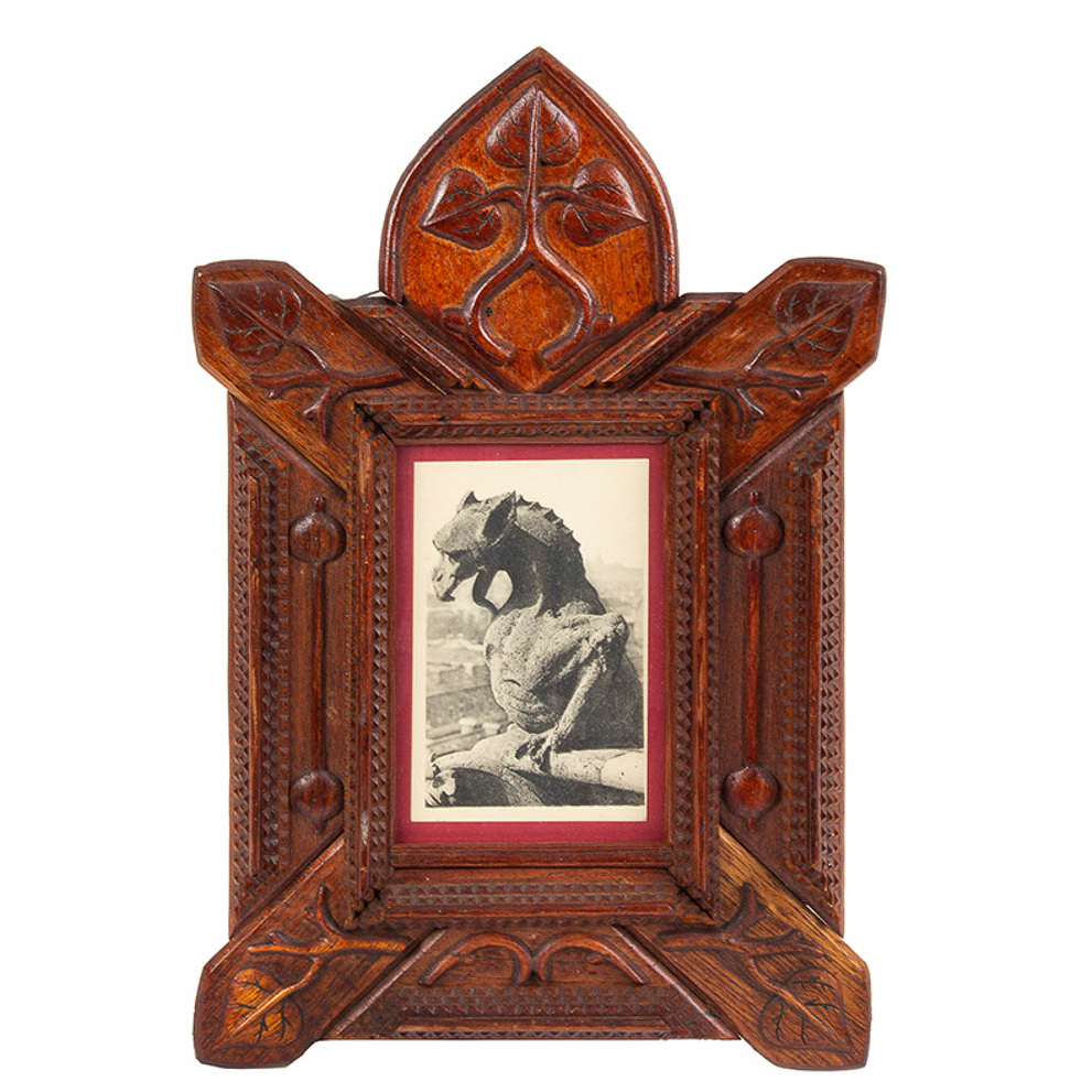 Decorated with Naturalistic carved twigs and leaves with steep notched pyramiding. Each is fitted with an antique postcard displaying French Gargoyles. The original surface remains.