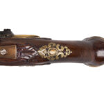 A good pair with sighted barrels [black] ornamented with overlayed engraved and repousse strapwork. The walnut stock is carved at breech tang; carving surrounds the rear entry pipe… continuing the length of ramrod channel to muzzle. Brass furniture including a finely cut/pierced scrolled/foliate sideplate featuring a man on horseback and sea serpents. The triggerguard bow displays a Greenman-like mask, the long tangs are engraved as is the rear entry pipe. The eared butt cap displays a grotesque mask. The thumbpiece is pierced. The cock, frizzen, and frizzen spring are chisel cut/engraved.