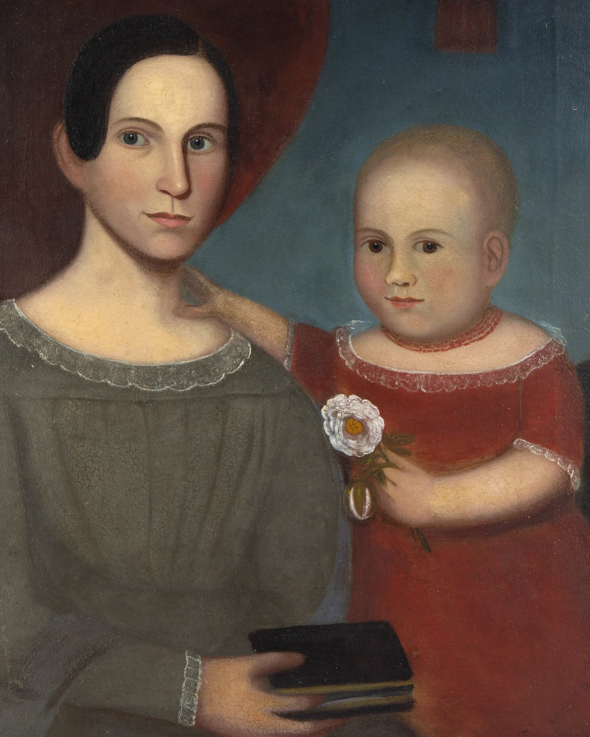 Unsigned oil on canvas depicting a mother sitting holding a book with her child standing on her left in a red dress with coral necklace, holding a flower.