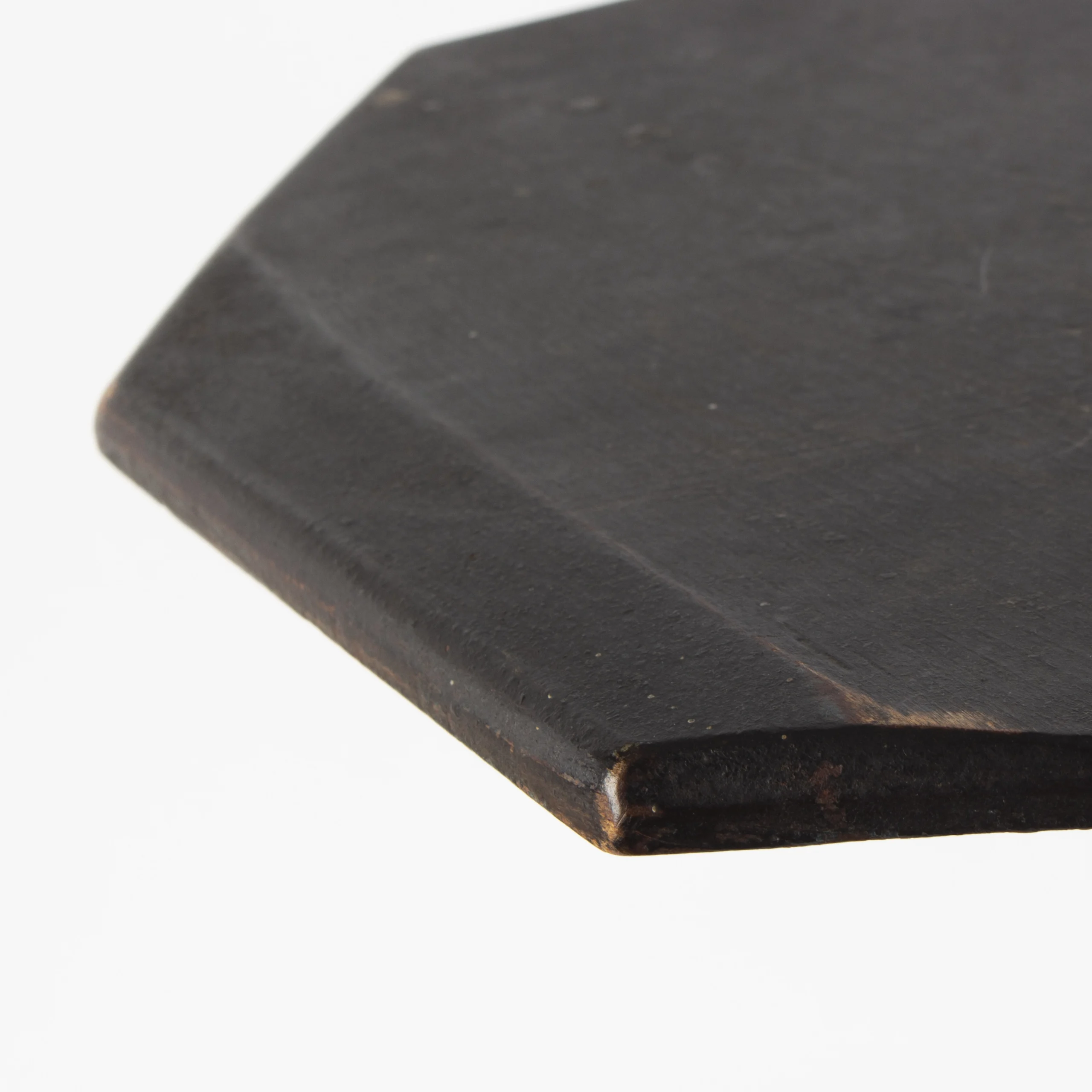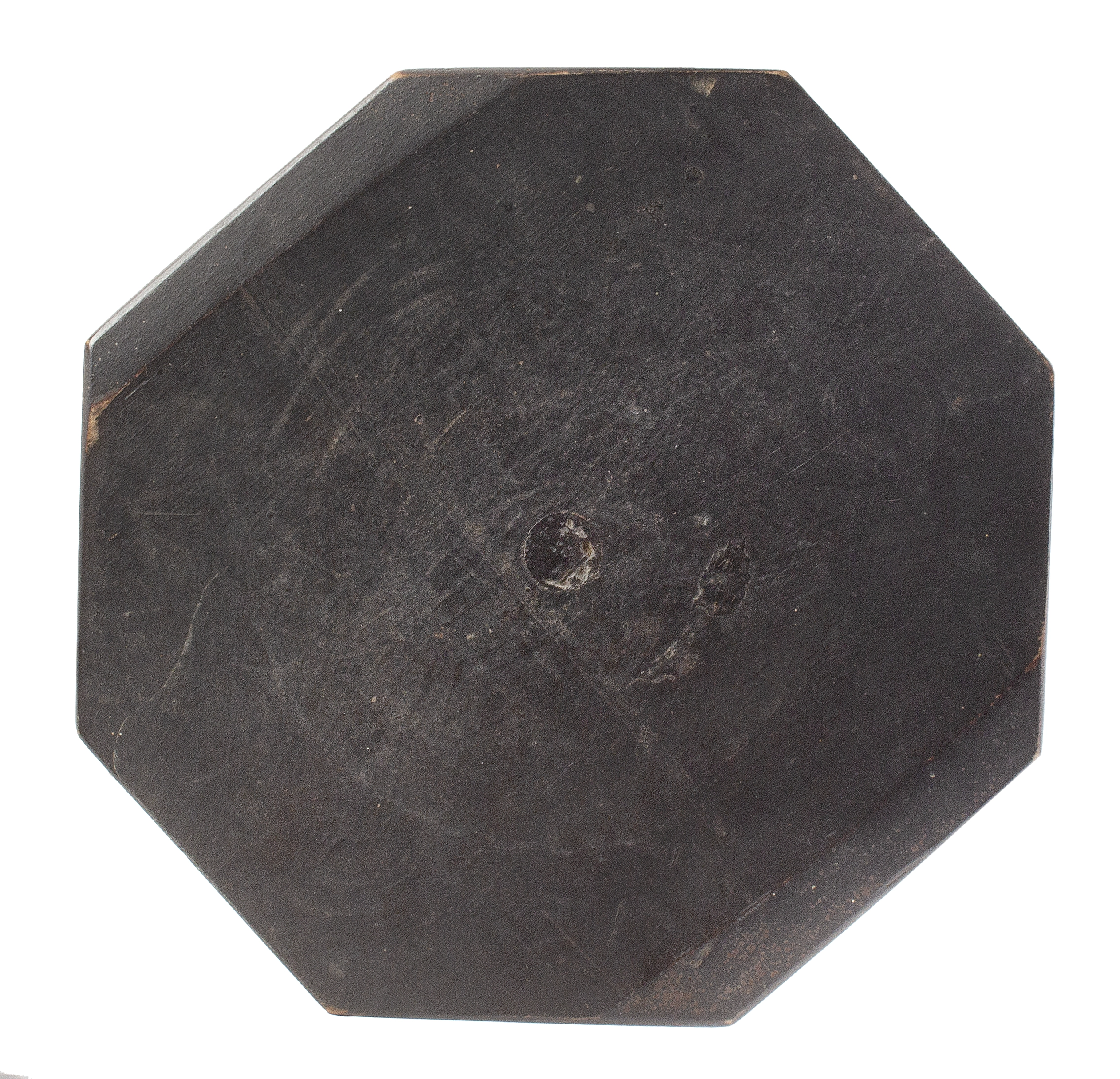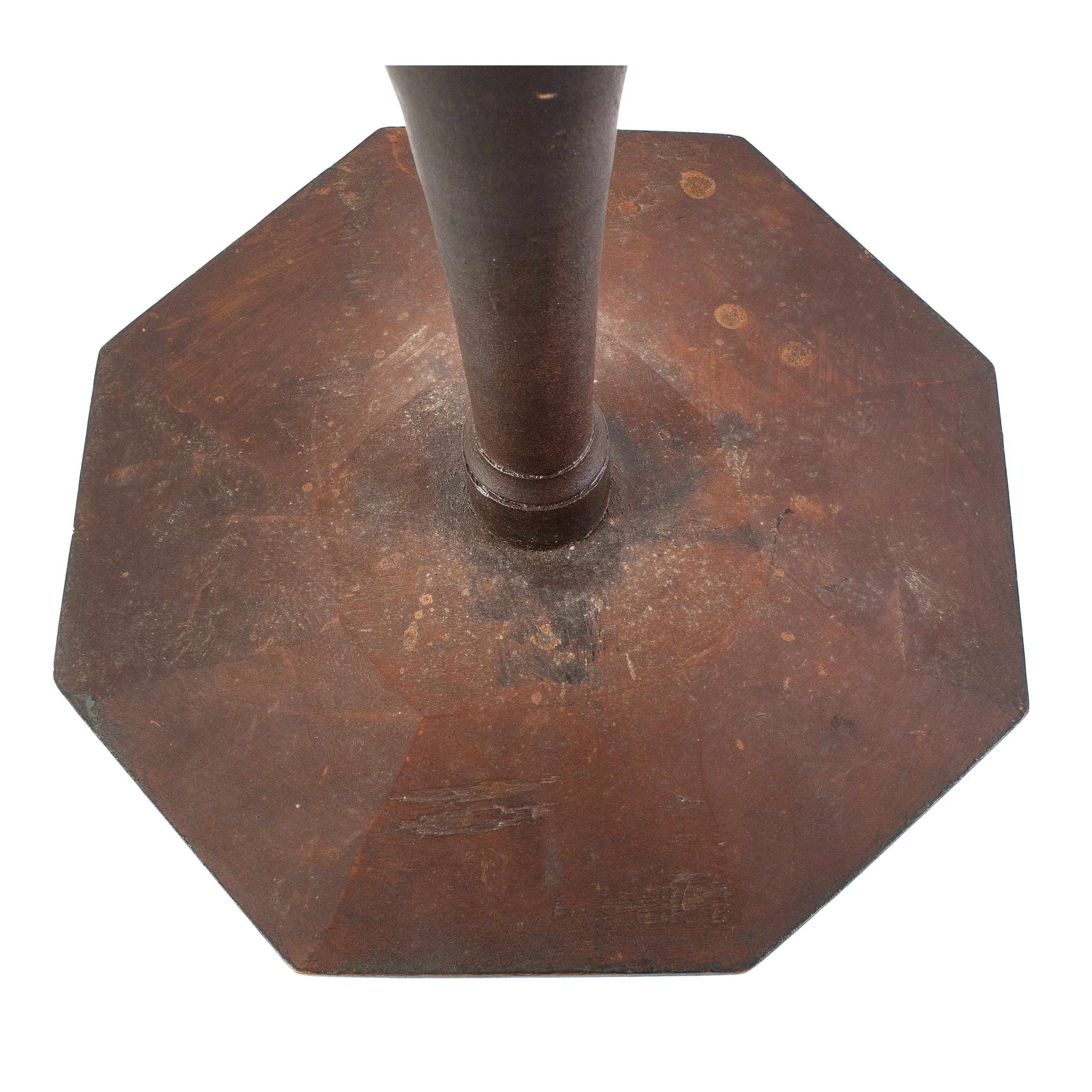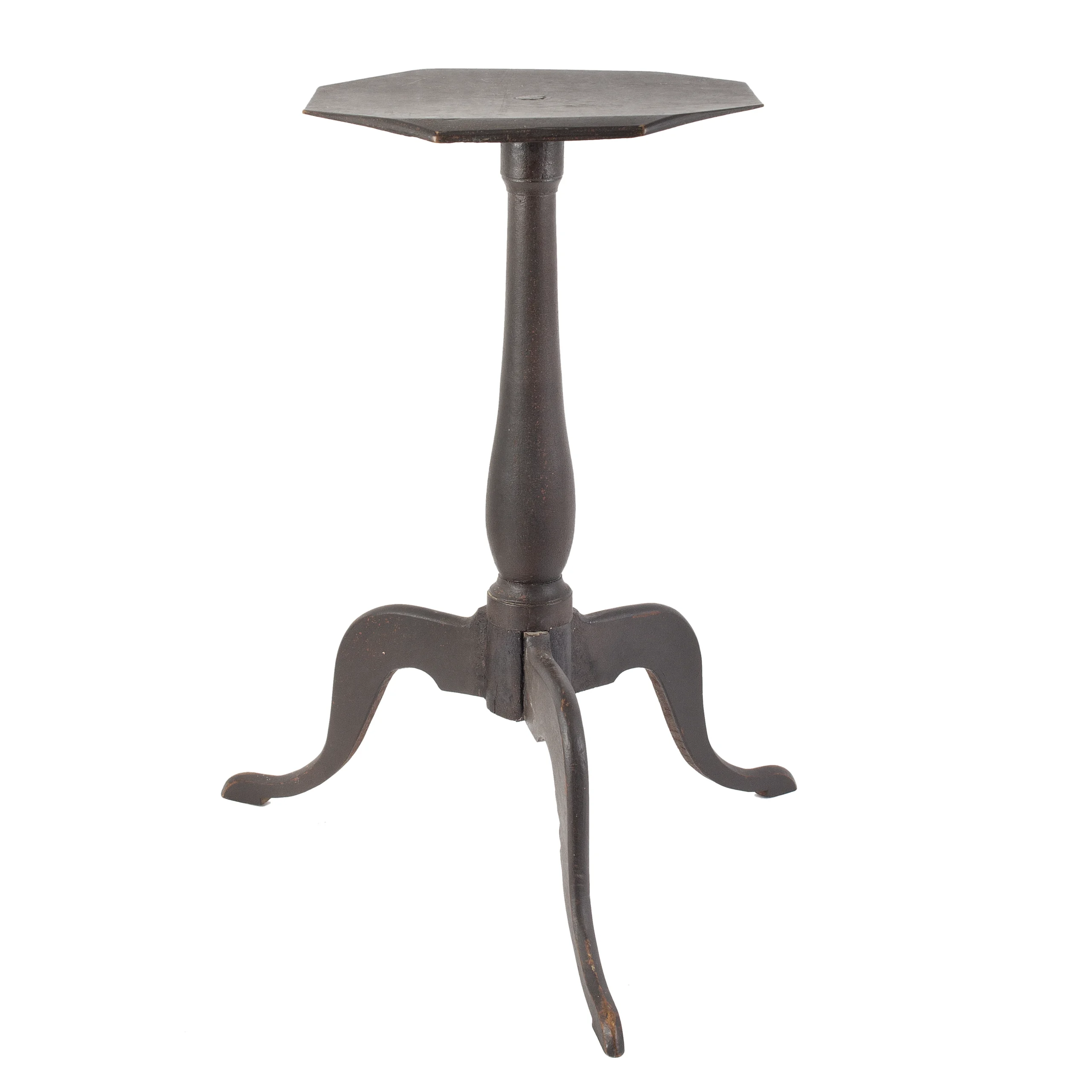Two opposing segments of the octagonal top are chamfered as are all segments of the underside. The baluster standard is raised on cabriole legs resting on pad feet. This elegant little table features a period surface in dry patina.