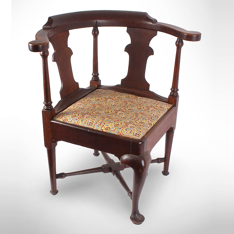 The shaped crest above a concave arm-rail continuing to out-scrolling grips above column and ring-turned stiles centering solid splats over a square seat frame fitted with a conforming slip-seat, raised on a cabriole front leg with pad foot and turned tapered side and rear legs joined by turned cross stretchers.