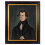 The artist enjoyed a long career mostly in Upstate New York and a period in the Midwest, and Pennsylvania [there are no extant works from his years in Pennsylvania]. With one exception, all known portraits are painted on hand-hewn tulipwood, pine, and poplar wood panels. Curtis’s oeuvre is distinctive, the outlines of the faces, noses, and bushy eyebrows are boldly emphasized; noses are often elongated, foreheads are prominent. The philtrum, [dimple in the upper lip], is often deep. Some of the artists’ subjects feature a subtle, graduated nimbus effect centering the head and upper body. Most always the thumbs are hidden behind books, tucked into clothing, or otherwise disguised.