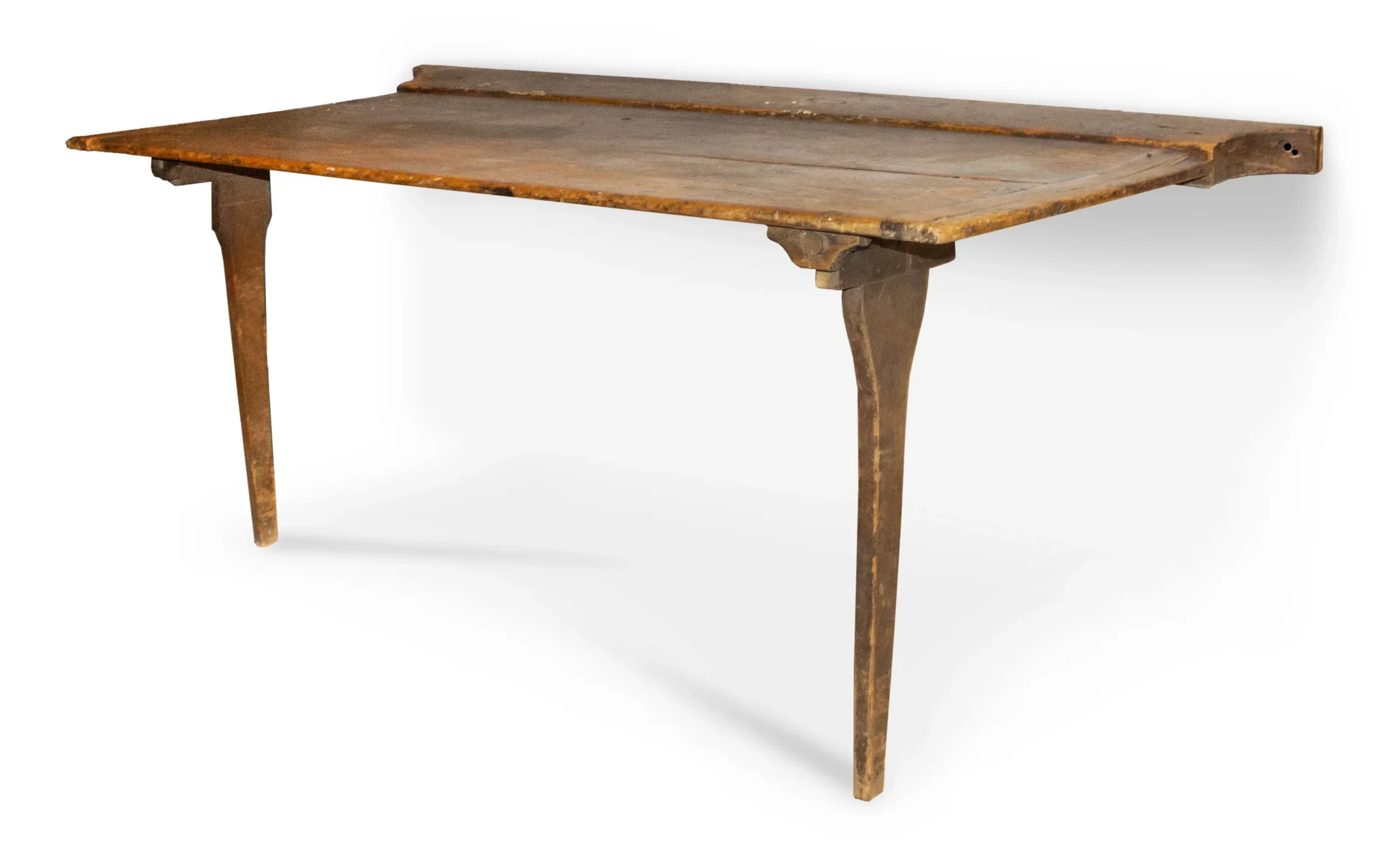 Mechanism: The single-board hand planed top hinges down from the stout, shaped wall cleat via two period butt hinges. When in use, it deploys fully supported by two tapering swing-out legs pivoting on large wooden dowels creating solid stability without floor intrusion. Folds flat against the wall when not needed, reclaiming precious floor space.