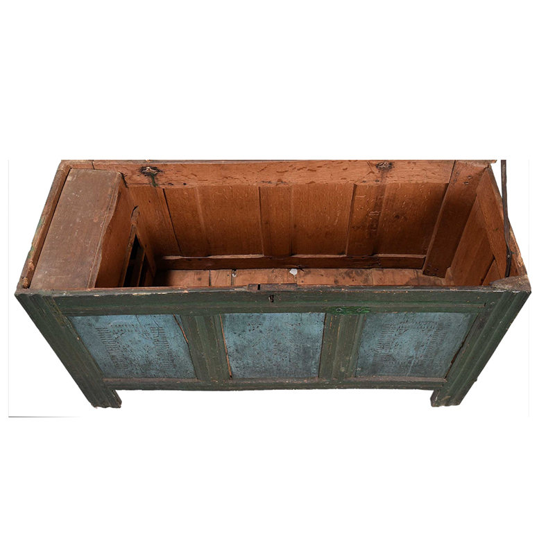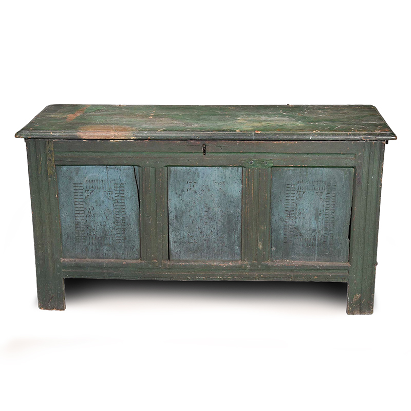 Probably Marshfield, Massachusetts area, a joined chest [molded rails and stiles] in very early pale blue and green paint remaining at full height. The interior retains a lidded till and fitted area underneath. The facade features three chip-carved blue painted panels. This rare example is the only known chest with chip carved square devices on each side of the diamond ornament, which conform to a common south shore formula, which was usually done with applied moldings.