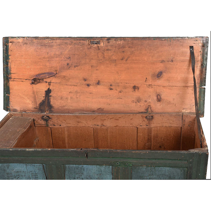 Item Condition: Very good original condition considering age. Retains original lid sans battens; original snipe hinges are typically lose; probably original lock, shrinkage to front panels with some edge cracks and trivial losses, thinning paint and trivial imperfections to top.