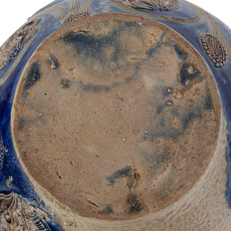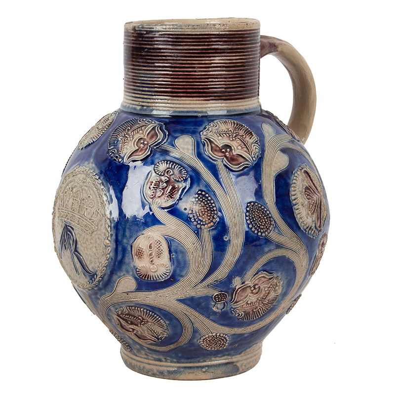 Highly impressive large Westerwald handled jug made for the English market. The jug features applied flowerheads brushed in manganese, also…seed pods and sgraffito stems. The jug is brushed with beautiful deep cobalt blue, the reeded neck in manganese. On the front is a large, applied roundel showing conjoined initials ‘A R’ (for ‘Anne Regina’ or Queen Anne of GB circa 1702-1714) with detailed crown above within a laurel leaf border. This lovely ovoid jug is exceptionally well potted, robust, and features crisp ornament.