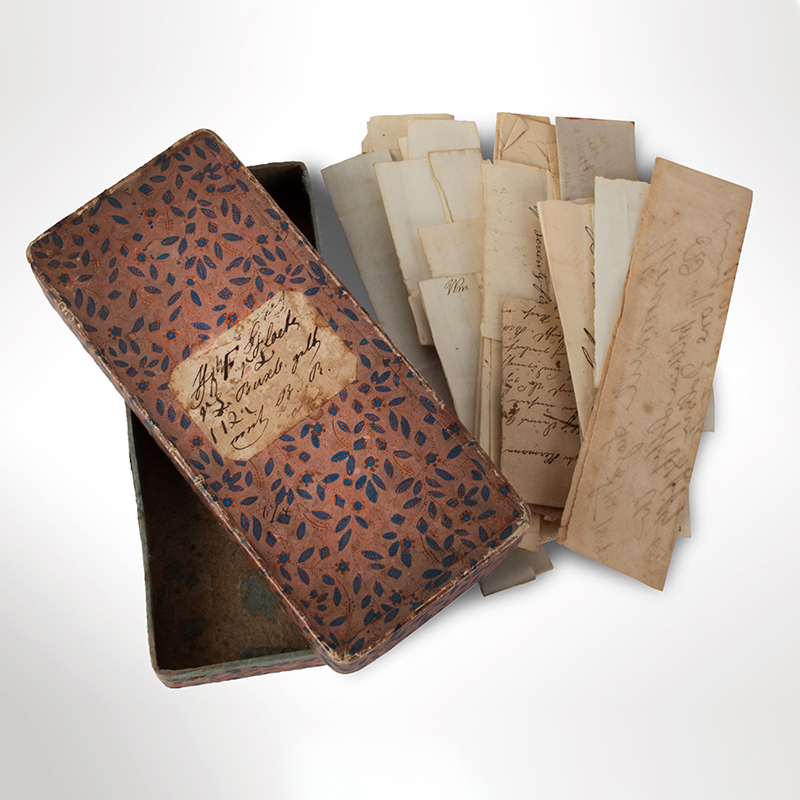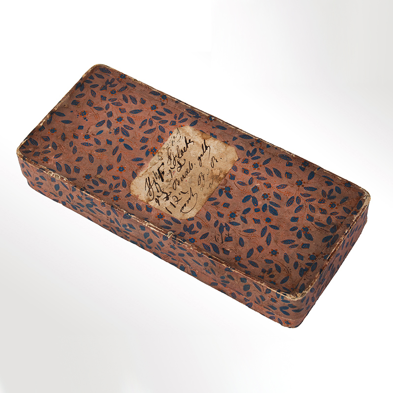 Possibly Pennsylvania, perhaps mercantile use; blue leafy devices having bittersweet dotting against an unusual mauve paper. The interior lined with blue paper. Illegible label on cover. Found within are fifteen 1840s and 1850s receipts.