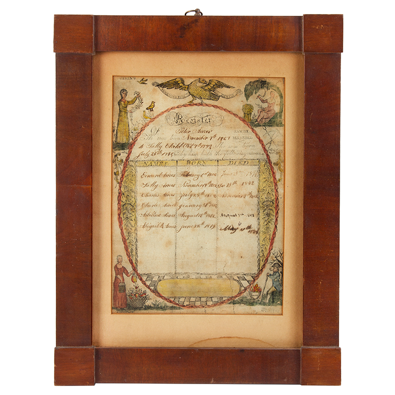 A Fraktur confidently attributed to Richard Brunton who was active circa 1800-1832… this being the Ames family register, an engraving with watercolor on paper displaying the vital statistics of Peter and Sally [nee: Child], and their six children. The borders are decorated with seasonal figures, potted flowers, and birds. The oval inner border is surmounted with a spread wing eagle grasping a banner within beak that reads “REMEMBER YOUR FAMILY”… The record compartments festooned with floral garlands.