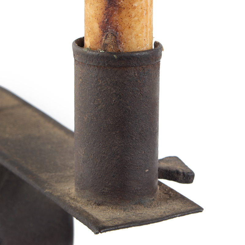 The candle nozzle with folded rim features a very rare stub ejector with conical thumbpiece; nozzle is on the horizontal flat stock adjustable bar held in place by the round spring. The conical base with low center of gravity is nearly impossible to knock over which was a great benefit to fire safety within shops and offices for which they were designed. The standard with shepherd’s crook terminus facilitates carrying.
