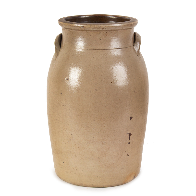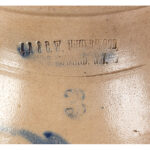 This three-gallon stoneware churn was made at the factory of J A & C W Underwood in Fort Edward, New York; it is decorated in cobalt with a pheasant perched on a tree stump. A similar pheasant was also used as decoration at the Norton Pottery in Bennington, Vermont.