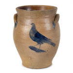 This nineteenth century stoneware crock was made in the Albany, New York area; the potter’s identity is part of ongoing research and archaeology. One side features an incised bird highlighted with cobalt; the other side is decorated with an incised flower highlighted with cobalt.