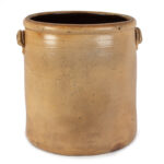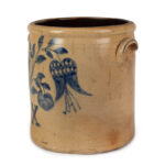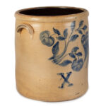 A rare and large stoneware crock, Ohio in origin decorated with wonderful folky cobalt floral design, which includes a tulip. This style of tulip ornaments decorated objects made by German immigrants and potters throughout Pennsylvania and Ohio during the eighteenth and nineteenth centuries. The crock is also decorated with a Roman numeral “X” in cobalt, which likely represents the ten gallon capacity.