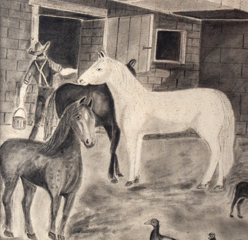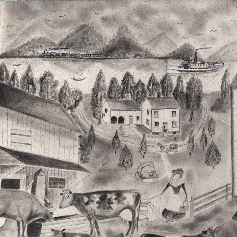 H.D. Payne, an enigmatic self-taught talent (possibly Harriet or Henry D., per census leads), infuses the work with Progressive Era optimism—progress without forsaking tradition – through fluid lines, spontaneous shading, and a warm, monochromatic palette. Faint flourishes, like the steamer smoke and a perched cat on the fence, add intimate charm. Likely a personal homage to a prosperous farmstead, displaying a rustic, agrarian vibe – possibly Western New York (think Finger Lakes or Niagara Frontier regions) which was a hotbed for such folk art in the early 1900s, often tied to farming communities.