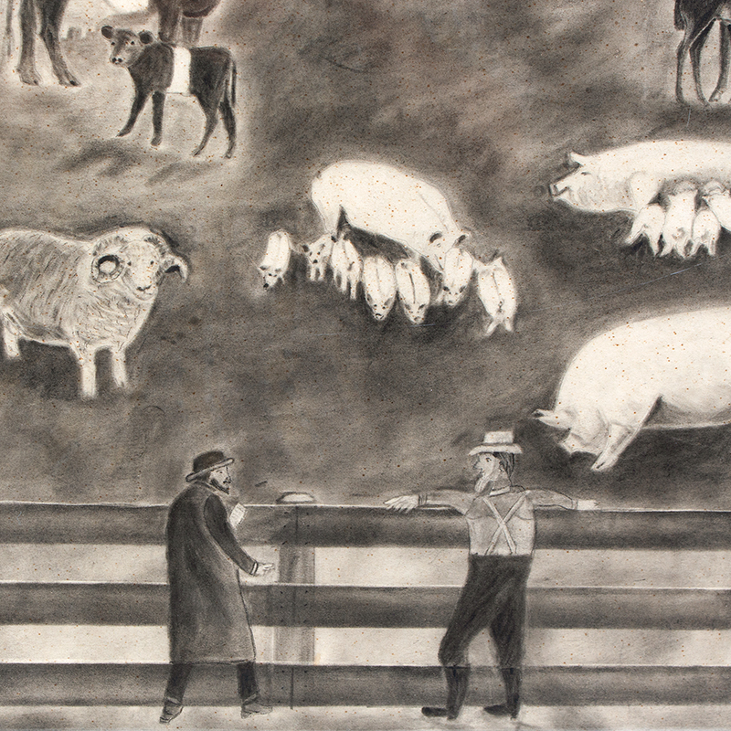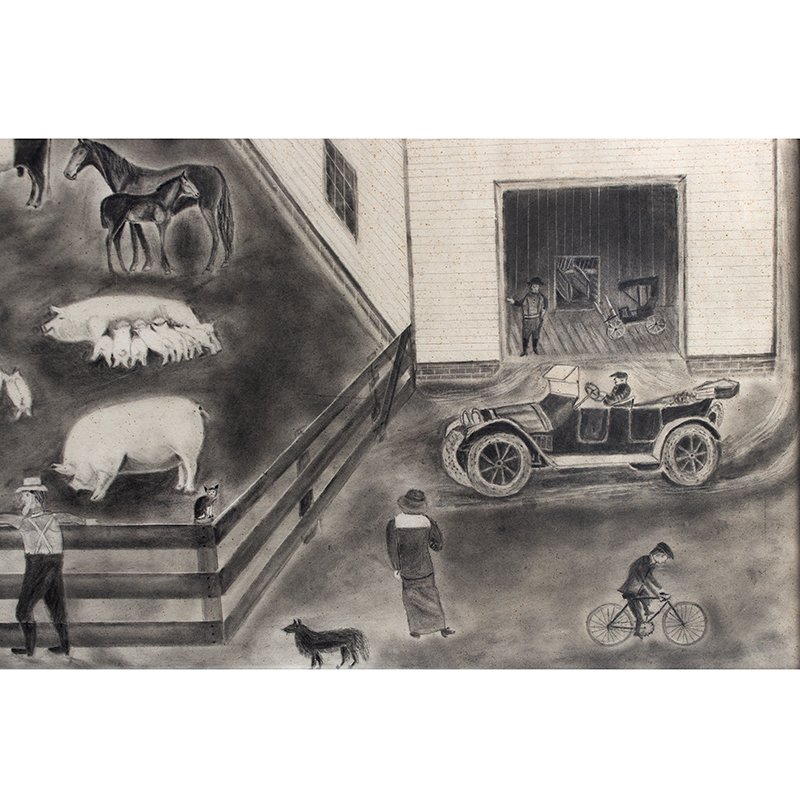A monumental and whimsically detailed folk art panorama capturing the idyllic rhythms of early 20th-century agrarian life, The Valley Farm unfolds as a vibrant chalk tableau of pastoral abundance and technological transition. Rendered in soft, earthy pastels on a grand horizontal sheet, the composition centers on a sprawling white clapboard farmhouse and expansive bank barn, ringed by fences enclosing herds of Holstein cows, draft horses, woolly sheep, plump pigs with nursing litter, and a lively flock of ducks, geese, chickens, and strutting turkeys. Human figures animate the scene – a suspendered farmer gesturing animatedly beside a milk pail, a bowler-hatted gentleman proffering a document (perhaps a surveyor or buyer), a long-skirted woman near the porch, and a cap-wearing boy pedaling a bicycle in the foreground—evoking the communal pulse of rural endeavor.