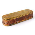 The elongated box with rounded ends displays an unusual interior scene featuring a string trio, architectural columns…also a vista showing scrolled railing and urn on plinth; buildings in the distance. The ends of lid ornamented with scrolled acanthus decoration. The sides display scrolled decoration. On the bottom a similar view with harpist playing to seated nobleman, similar vista and engraved ends.