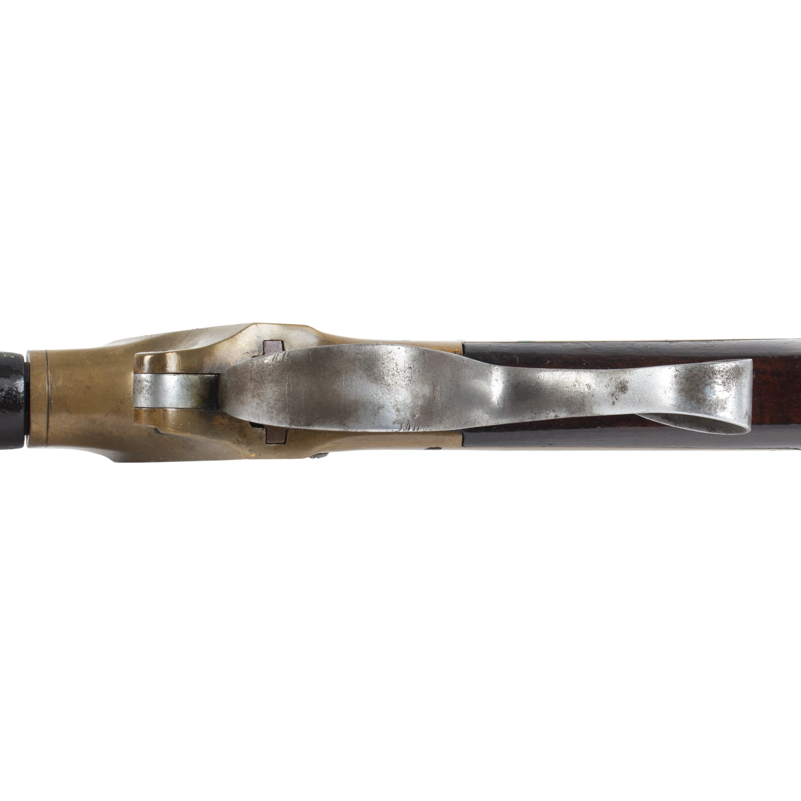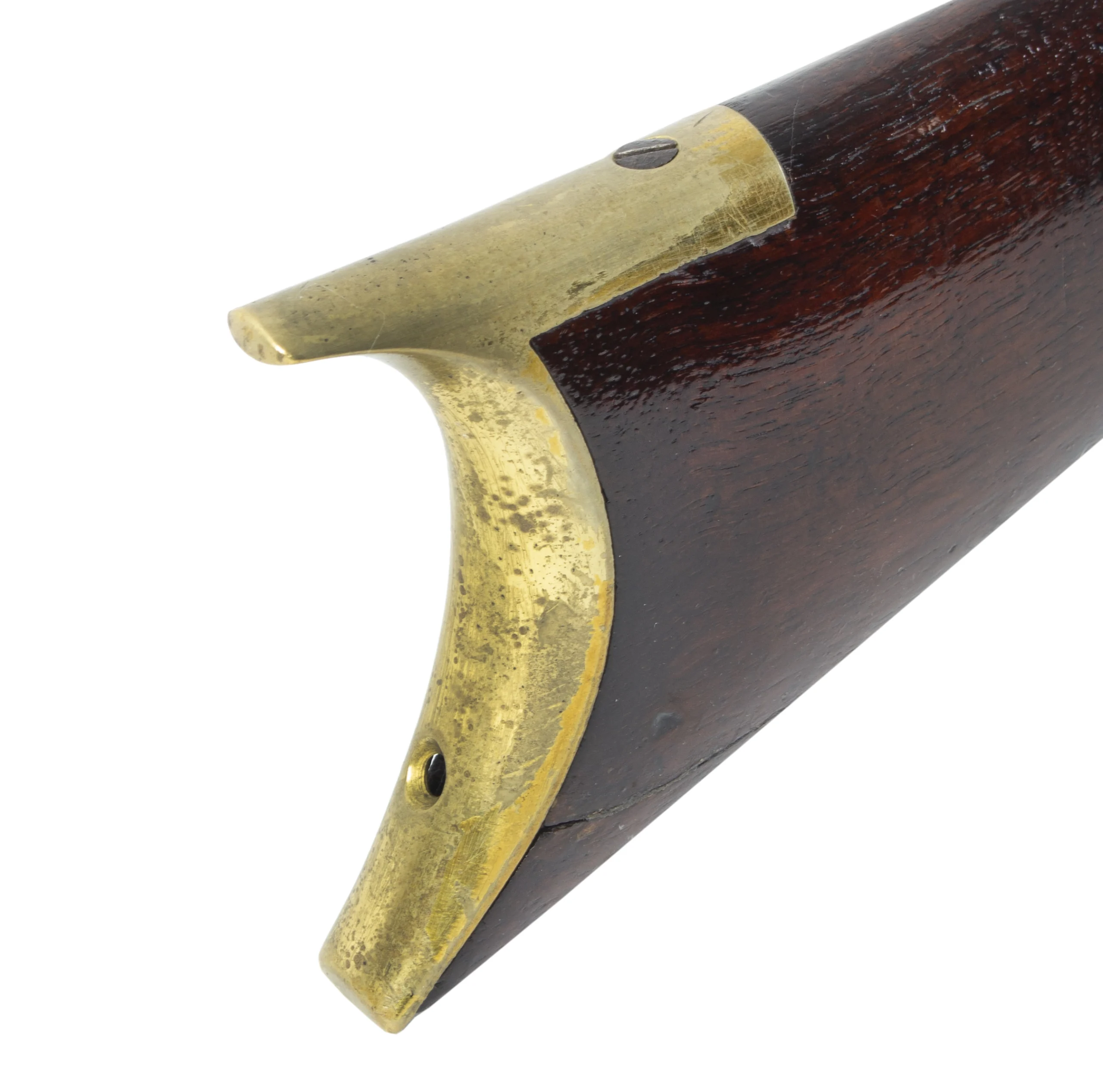 Item Condition: Very good with mellow patina on the brass frame and buttplate. The barrel has a brown patina, and the trigger guard/lever a gray patina; the trigger guard displays scattered trivial light surface rust that looks more like staining. The wood has been revarnished. There is a sliver of wood missing [2.25” by 3/8”] at the rear of the left side forearm.