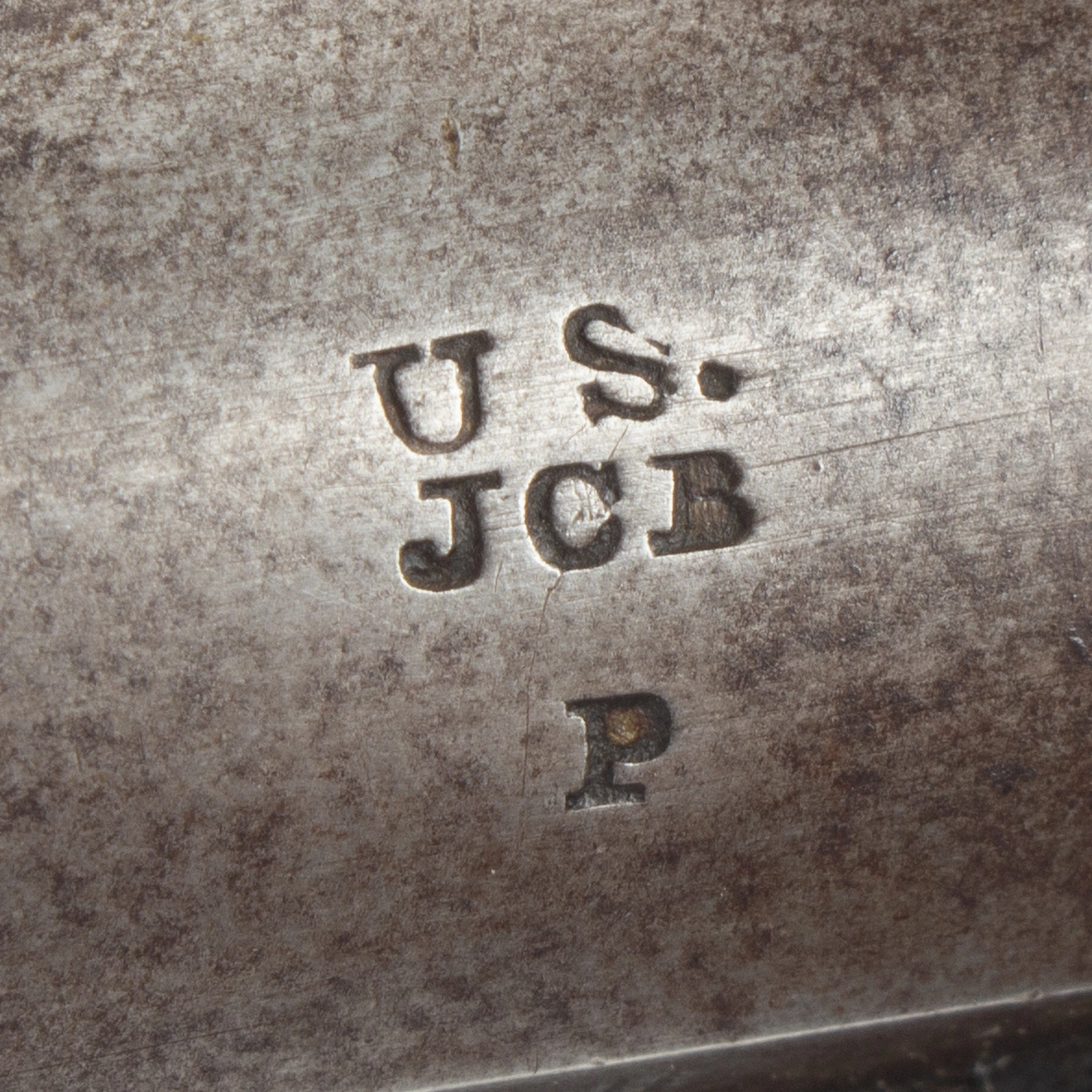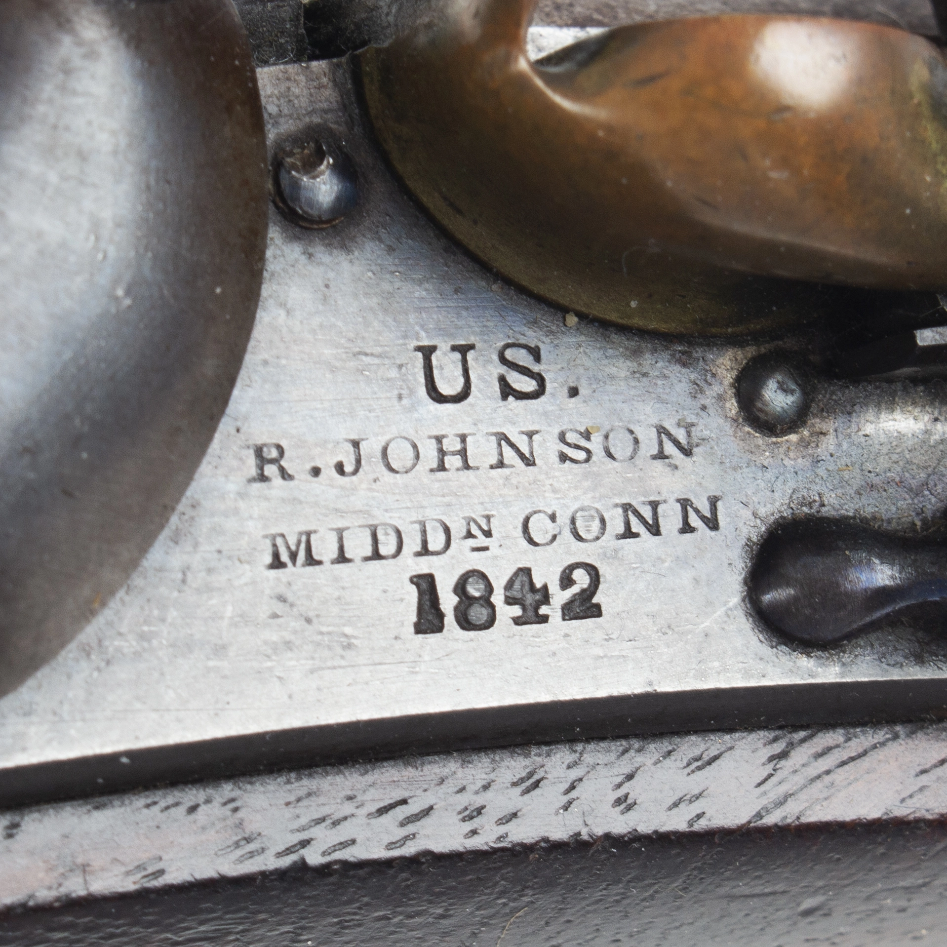 The pistol has a brass front sight blade, dished rear sight, swivel ramrod with button head and iron mountings; brass pan. Excellent lock markings: the lock is marked “U.S. / R. JOHNSON / MIDDN CONN / 1842″. Upper barrel at breech is marked “U.S.” over “JCB” [Joseph Cooper Brag, civilian employee of the Ordinance Department] over “P”. The stock displays sharp inspector’s marks: “JH” [Joseph Hannis] and “W.A.T [William A. Thornton, Brevet Brigadier General, U.S. Army; Chief Inspector Contract Arms]”.