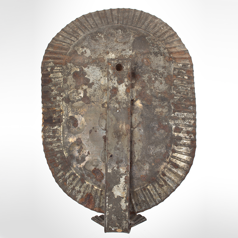 Large oval dished sconce with crimped border centering planished bosses; single nozzle with folded rim and ejection slit within crimped drip pan.