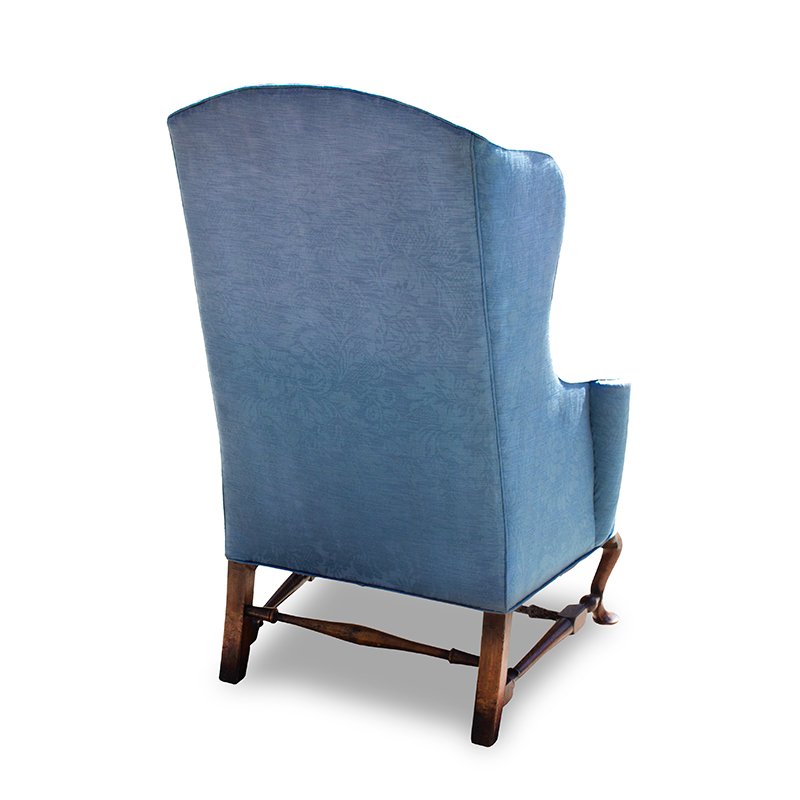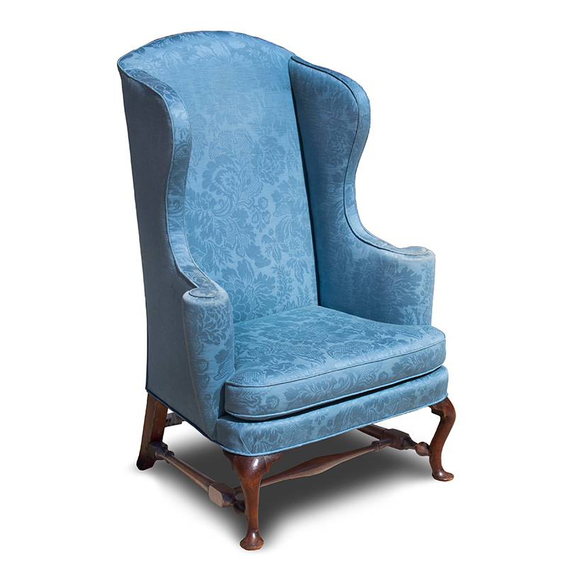 A fine Massachusetts Queen Anne upholstered walnut easy chair [or wing chair], featuring arched crest and rolled arms on cabriole legs and pad feet. Set with fine blue damask reversible conservation upholstery by Leroy Graves of Williamsburg.